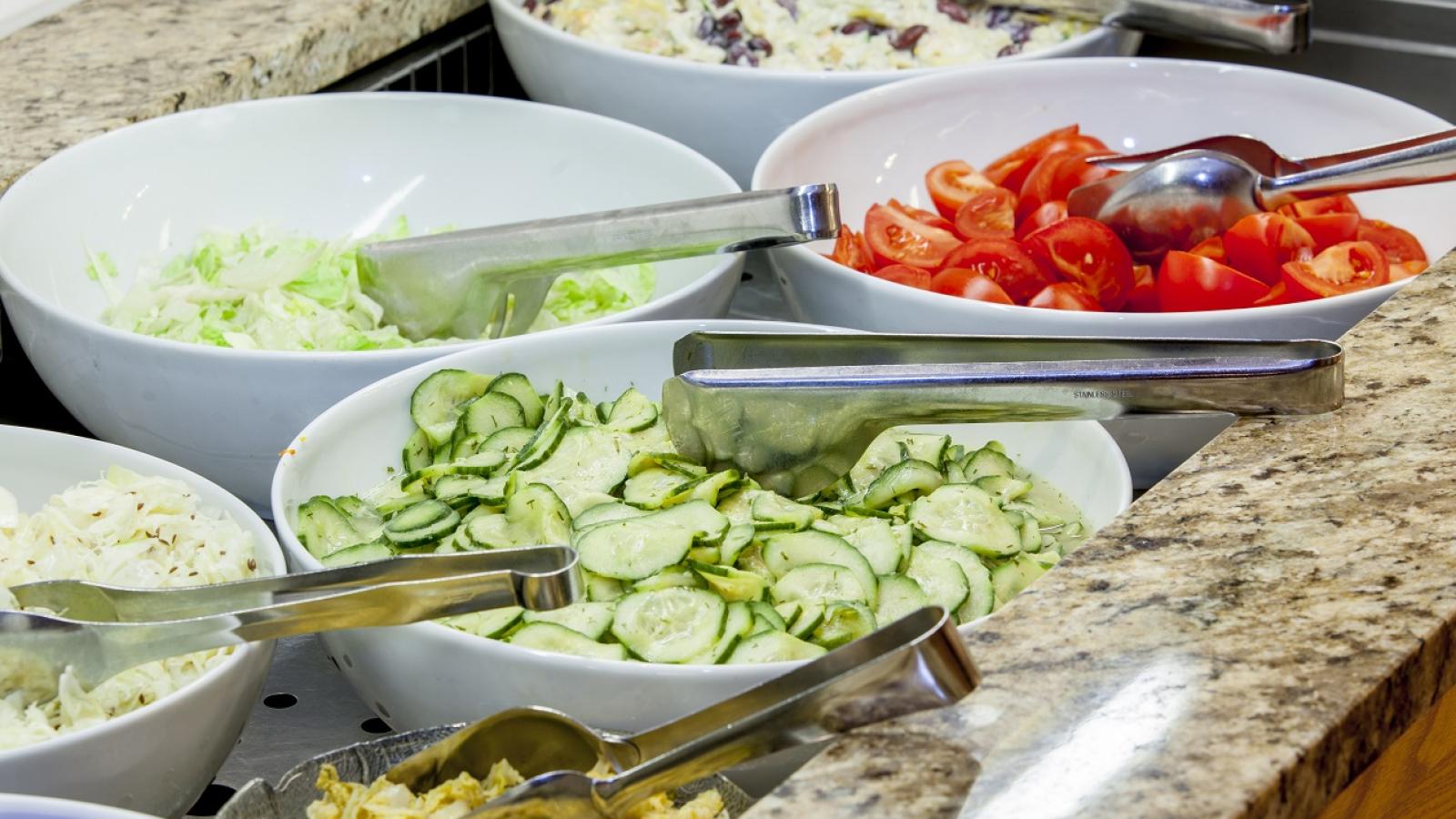 Den Auftakt bildet ein täglich frisch zubereitetes Salatbuffet. Anschließend servieren wir eine heiße Suppe oder eine Vorspeise, bevor Sie bei der Menüwahl zwischen drei verschiedenen Hauptgerichten wählen können – eines davon ist stets vegetarisch.